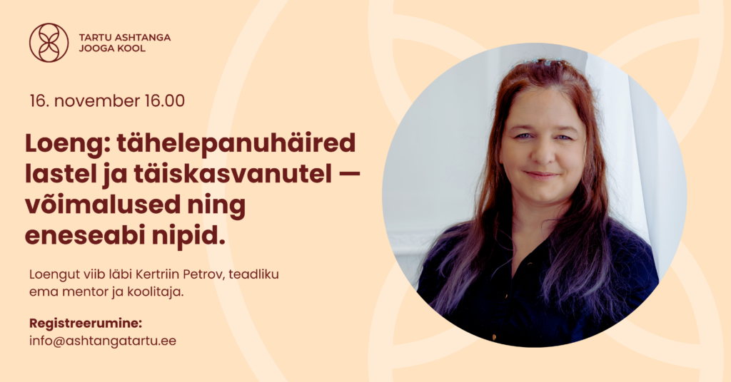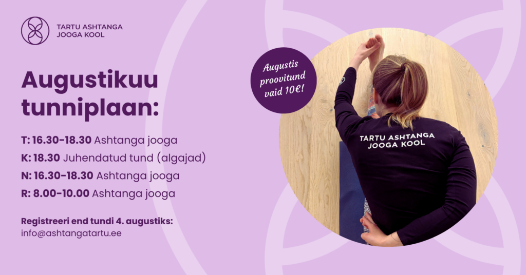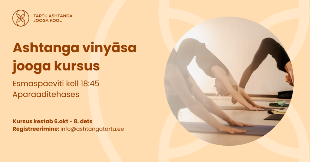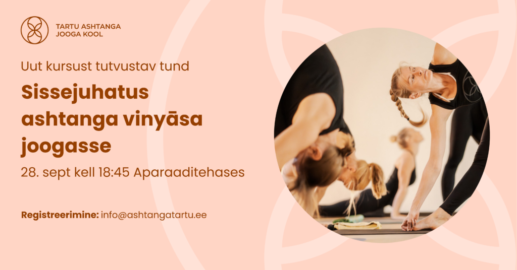 Sissejuhatav tund Pühapäev, 28. september kell 18.45–20.15 Kui sa pole päris kindel, kas ashtanga vinyāsa jooga on just sinu jaoks, siis tule ja osale kursust sissejuhatavas tunnis! Lühike tutvustus praktikasse Ashtanga vinyāsa jooga Vaatame üle kursusel käsitletavad teemad Osalemispanus: 25 €(Kui otsustad kursusega liituda, arvestatakse see summa kursuse osalustasust maha.) Algajate kursus toimub esmaspäeviti […]