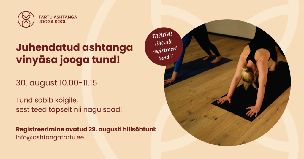 Jooga Tartus – tasuta Ashtanga Vinyāsa joogatund Uus hooaeg on alanud ja ootame Sind joogakooli! Kõigil huvilistel on võimalus osaleda Ashtanga Vinyāsa jooga tunnis Tartus, lihtsalt registreerides end tundi. Osalustasu ei ole. Ashtanga jooga sobib nii algajatele kui ka edasijõudnutele – see arendab keha, parandab painduvust ja toob meelerahu. Kui tunned, et see teekond kõnetab […]